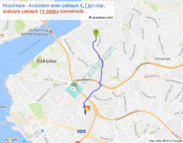 Kirazlıtepe - Acıbadem arası yaklaşık olarak 90 km/h ile yukarıda belirtilen sürede olup, iki yerin kuş uçuşu uzaklığı (mesafesi) 4'dir. Yolculuk otobüsle 18 dakika sürmektedir.