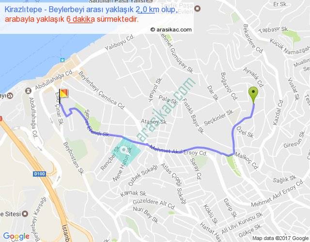 Kirazlıtepe - Beylerbeyi arası yaklaşık olarak 90 km/h ile yukarıda belirtilen sürede olup, iki yerin kuş uçuşu uzaklığı (mesafesi) 1'dir. Yolculuk otobüsle 7 dakika sürmektedir.