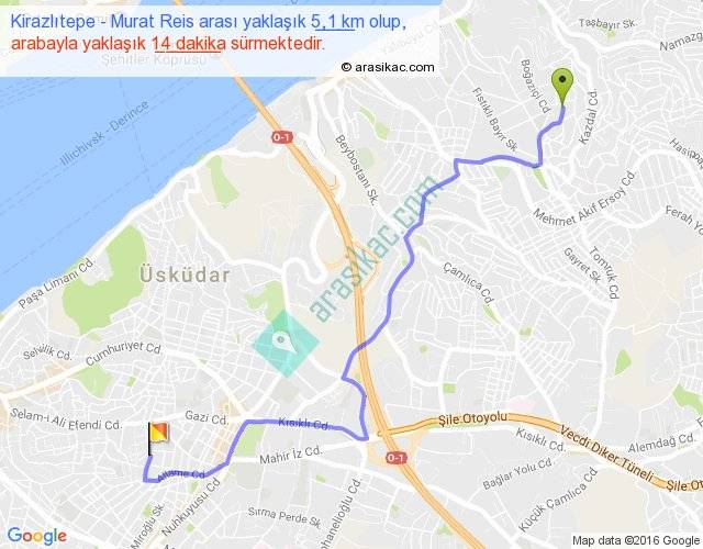 Kirazlıtepe - Murat Reis arası yaklaşık olarak 90 km/h ile yukarıda belirtilen sürede olup, iki yerin kuş uçuşu uzaklığı (mesafesi) 4'dir. Yolculuk otobüsle 18 dakika sürmektedir.