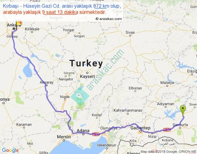 Kırbaşı - Hüseyin Gazi Cd. arası yaklaşık olarak 90 km/h ile yukarıda belirtilen sürede olup, iki yerin kuş uçuşu uzaklığı (mesafesi) 577'dir. Eğer belirtilen yerler arasında uçak seferi var ise bu süre uçakla 53 dakika'ya kadar düşebilir. Yolculuk otobüsle 11 saat 58 dakika sürmektedir.
