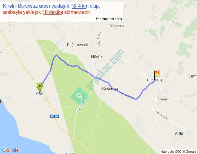 Kıreli - Burunsuz arası yaklaşık olarak 90 km/h ile yukarıda belirtilen sürede olup, iki yerin kuş uçuşu uzaklığı (mesafesi) 11'dir. Yolculuk otobüsle 23 dakika sürmektedir.