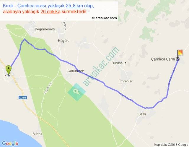 Kıreli - Çamlıca arası yaklaşık olarak 90 km/h ile yukarıda belirtilen sürede olup, iki yerin kuş uçuşu uzaklığı (mesafesi) 17'dir. Yolculuk otobüsle 33 dakika sürmektedir.
