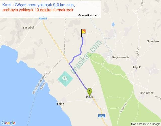 Kıreli - Göçeri arası yaklaşık olarak 90 km/h ile yukarıda belirtilen sürede olup, iki yerin kuş uçuşu uzaklığı (mesafesi) 7'dir. Yolculuk otobüsle 13 dakika sürmektedir.
