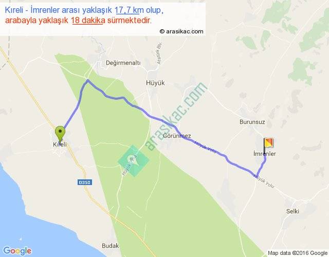 Kıreli - İmrenler arası yaklaşık olarak 90 km/h ile yukarıda belirtilen sürede olup, iki yerin kuş uçuşu uzaklığı (mesafesi) 12'dir. Yolculuk otobüsle 23 dakika sürmektedir.