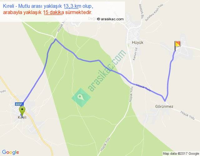 Kıreli - Mutlu arası yaklaşık olarak 90 km/h ile yukarıda belirtilen sürede olup, iki yerin kuş uçuşu uzaklığı (mesafesi) 8'dir. Yolculuk otobüsle 19 dakika sürmektedir.