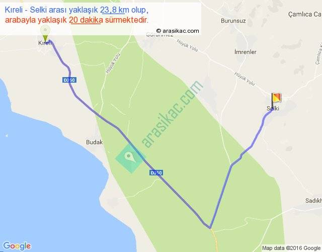 Kıreli - Selki arası yaklaşık olarak 90 km/h ile yukarıda belirtilen sürede olup, iki yerin kuş uçuşu uzaklığı (mesafesi) 14'dir. Yolculuk otobüsle 26 dakika sürmektedir.