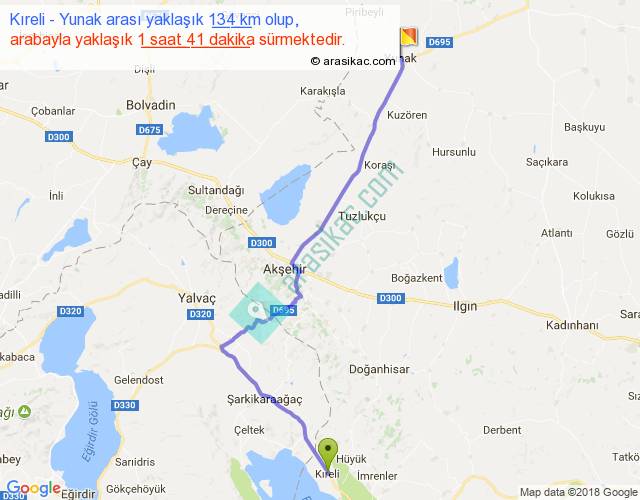 Kıreli - Yunak arası yaklaşık olarak 90 km/h ile yukarıda belirtilen sürede olup, iki yerin kuş uçuşu uzaklığı (mesafesi) 100'dir. Yolculuk otobüsle 2 saat 11 dakika sürmektedir.
