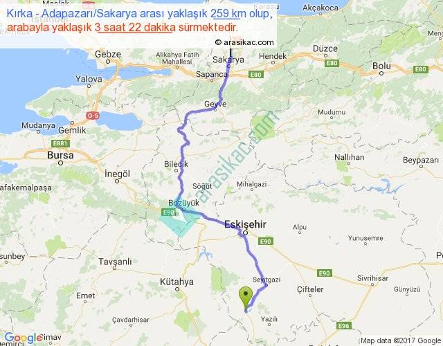 Kırka - Adapazarı Sakarya arası yaklaşık olarak 90 km/h ile yukarıda belirtilen sürede olup, iki yerin kuş uçuşu uzaklığı (mesafesi) 171'dir. Yolculuk otobüsle 4 saat 22 dakika sürmektedir.