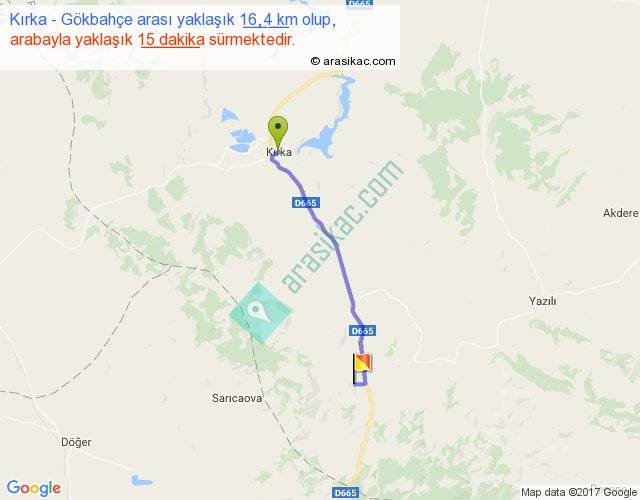 Kırka - Gökbahçe arası yaklaşık olarak 90 km/h ile yukarıda belirtilen sürede olup, iki yerin kuş uçuşu uzaklığı (mesafesi) 14'dir. Yolculuk otobüsle 19 dakika sürmektedir.