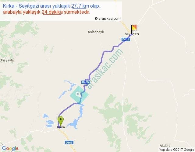 Kırka - Seyitgazi arası yaklaşık olarak 90 km/h ile yukarıda belirtilen sürede olup, iki yerin kuş uçuşu uzaklığı (mesafesi) 23'dir. Yolculuk otobüsle 31 dakika sürmektedir.