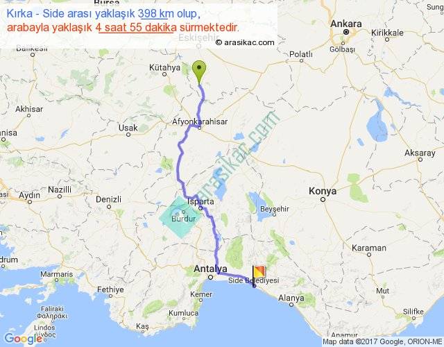 Kırka - Side arası yaklaşık olarak 90 km/h ile yukarıda belirtilen sürede olup, iki yerin kuş uçuşu uzaklığı (mesafesi) 287'dir. Eğer belirtilen yerler arasında uçak seferi var ise bu süre uçakla 26 dakika'ya kadar düşebilir. Yolculuk otobüsle 6 saat 23 dakika sürmektedir.