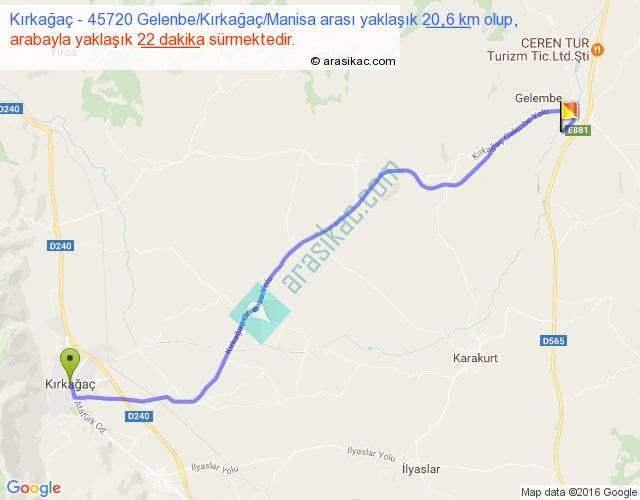 Kırkağaç - 45720 Gelenbe Kırkağaç Manisa arası yaklaşık olarak 90 km/h ile yukarıda belirtilen sürede olup, iki yerin kuş uçuşu uzaklığı (mesafesi) 16'dir. Yolculuk otobüsle 28 dakika sürmektedir.