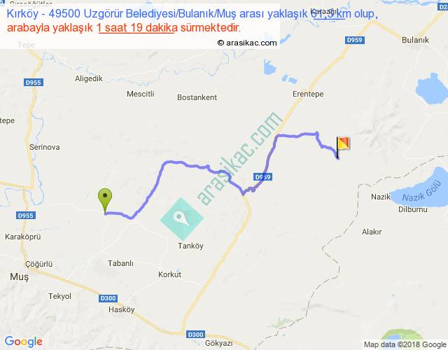 Kırköy - 49500 Uzgörür Belediyesi Bulanık Muş arası yaklaşık olarak 90 km/h ile yukarıda belirtilen sürede olup, iki yerin kuş uçuşu uzaklığı (mesafesi) 40'dir. Yolculuk otobüsle 1 saat 42 dakika sürmektedir.