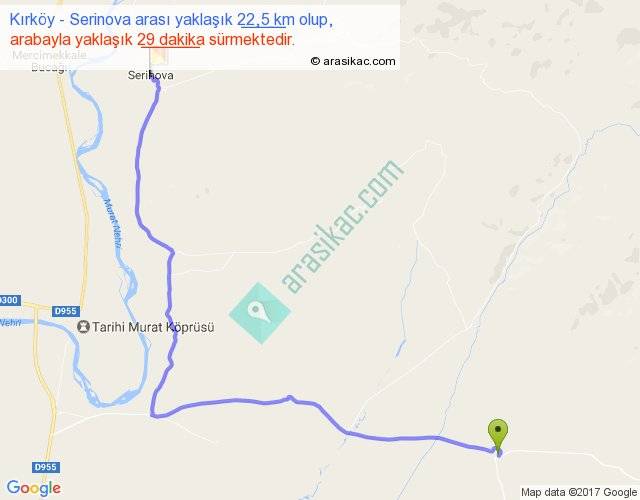 Kırköy - Serinova arası yaklaşık olarak 90 km/h ile yukarıda belirtilen sürede olup, iki yerin kuş uçuşu uzaklığı (mesafesi) 15'dir. Yolculuk otobüsle 37 dakika sürmektedir.