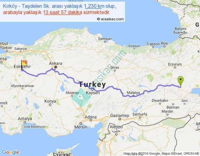 Kırköy - Taşdelen Sk. arası yaklaşık olarak 90 km/h ile yukarıda belirtilen sürede olup, iki yerin kuş uçuşu uzaklığı (mesafesi) 960'dir. Eğer belirtilen yerler arasında uçak seferi var ise bu süre uçakla 1 saat 28 dakika'ya kadar düşebilir. Yolculuk otobüsle 18 saat 8 dakika sürmektedir.