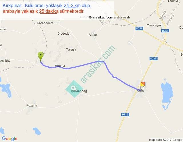 Kırkpınar - Kulu arası yaklaşık olarak 90 km/h ile yukarıda belirtilen sürede olup, iki yerin kuş uçuşu uzaklığı (mesafesi) 21'dir. Yolculuk otobüsle 32 dakika sürmektedir.