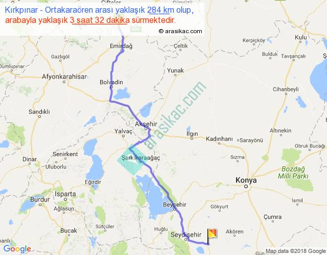 Kırkpınar - Ortakaraören arası yaklaşık olarak 90 km/h ile yukarıda belirtilen sürede olup, iki yerin kuş uçuşu uzaklığı (mesafesi) 218'dir. Yolculuk otobüsle 4 saat 35 dakika sürmektedir.