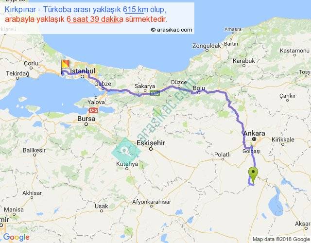 Kırkpınar - Türkoba arası yaklaşık olarak 90 km/h ile yukarıda belirtilen sürede olup, iki yerin kuş uçuşu uzaklığı (mesafesi) 423'dir. Eğer belirtilen yerler arasında uçak seferi var ise bu süre uçakla 39 dakika'ya kadar düşebilir. Yolculuk otobüsle 8 saat 38 dakika sürmektedir.