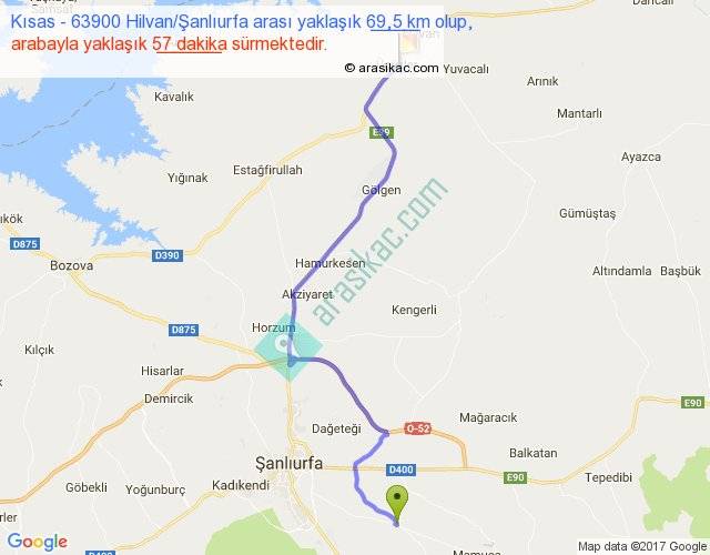 Kısas - 63900 Hilvan Şanlıurfa arası yaklaşık olarak 90 km/h ile yukarıda belirtilen sürede olup, iki yerin kuş uçuşu uzaklığı (mesafesi) 50'dir. Yolculuk otobüsle 1 saat 14 dakika sürmektedir.