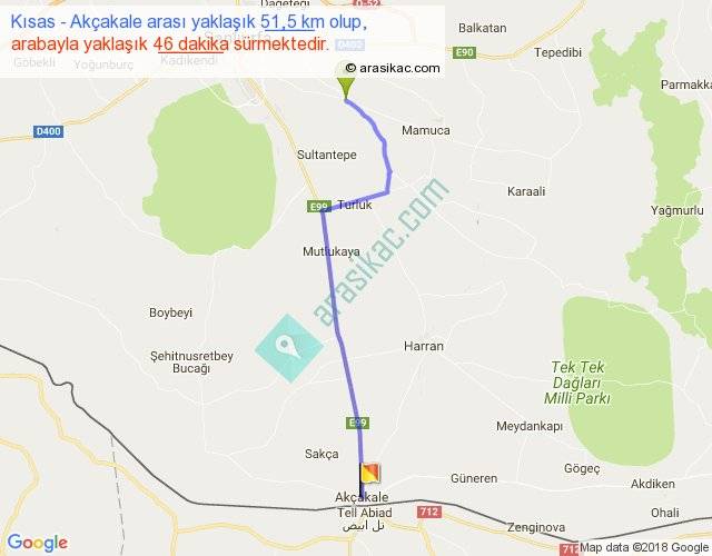 Kısas - Akçakale arası yaklaşık olarak 90 km/h ile yukarıda belirtilen sürede olup, iki yerin kuş uçuşu uzaklığı (mesafesi) 43'dir. Yolculuk otobüsle 59 dakika sürmektedir.