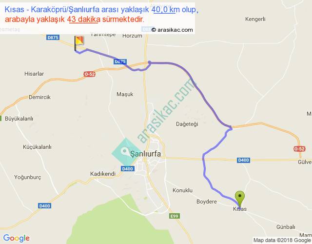 Kısas - Karaköprü Şanlıurfa arası yaklaşık olarak 90 km/h ile yukarıda belirtilen sürede olup, iki yerin kuş uçuşu uzaklığı (mesafesi) 28'dir. Yolculuk otobüsle 55 dakika sürmektedir.