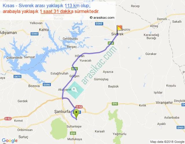 Kısas - Siverek arası yaklaşık olarak 90 km/h ile yukarıda belirtilen sürede olup, iki yerin kuş uçuşu uzaklığı (mesafesi) 79'dir. Yolculuk otobüsle 1 saat 58 dakika sürmektedir.