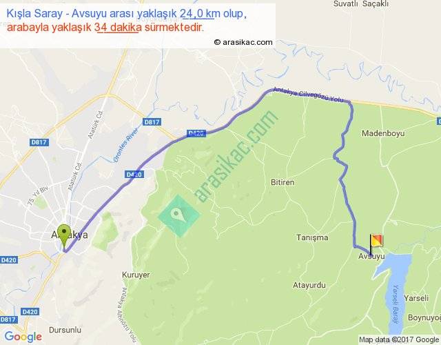 Kışla Saray - Avsuyu arası yaklaşık olarak 90 km/h ile yukarıda belirtilen sürede olup, iki yerin kuş uçuşu uzaklığı (mesafesi) 14'dir. Yolculuk otobüsle 44 dakika sürmektedir.