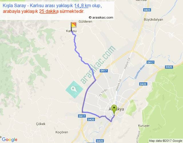 Kışla Saray - Karlısu arası yaklaşık olarak 90 km/h ile yukarıda belirtilen sürede olup, iki yerin kuş uçuşu uzaklığı (mesafesi) 10'dir. Yolculuk otobüsle 32 dakika sürmektedir.