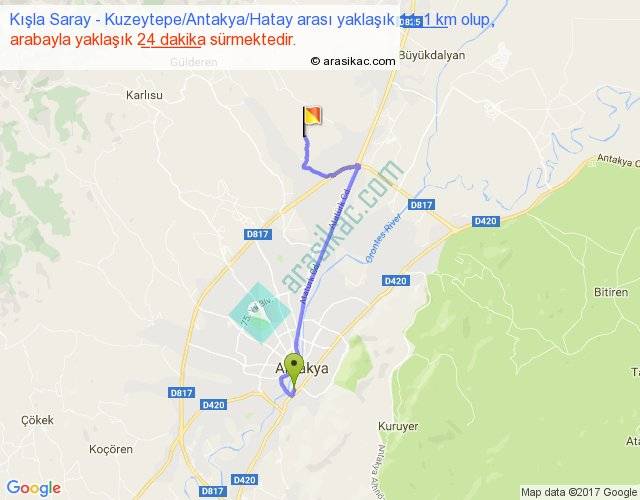 Kışla Saray - Kuzeytepe Antakya Hatay arası yaklaşık olarak 90 km/h ile yukarıda belirtilen sürede olup, iki yerin kuş uçuşu uzaklığı (mesafesi) 8'dir. Yolculuk otobüsle 31 dakika sürmektedir.