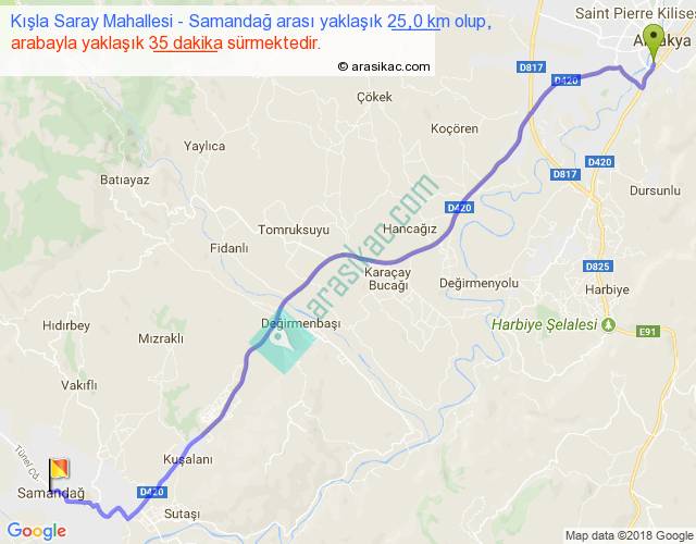 Kışla Saray Mahallesi - Samandağ arası yaklaşık olarak 90 km/h ile yukarıda belirtilen sürede olup, iki yerin kuş uçuşu uzaklığı (mesafesi) 21'dir. Yolculuk otobüsle 45 dakika sürmektedir.