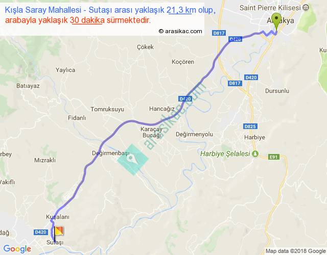 Kışla Saray Mahallesi - Sutaşı arası yaklaşık olarak 90 km/h ile yukarıda belirtilen sürede olup, iki yerin kuş uçuşu uzaklığı (mesafesi) 18'dir. Yolculuk otobüsle 39 dakika sürmektedir.