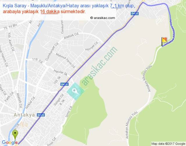 Kışla Saray - Maşuklu Antakya Hatay arası yaklaşık olarak 90 km/h ile yukarıda belirtilen sürede olup, iki yerin kuş uçuşu uzaklığı (mesafesi) 5'dir. Yolculuk otobüsle 20 dakika sürmektedir.