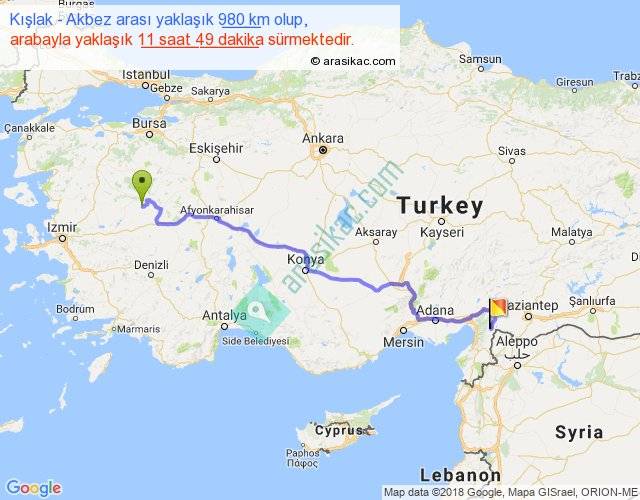 Kışlak - Akbez arası yaklaşık olarak 90 km/h ile yukarıda belirtilen sürede olup, iki yerin kuş uçuşu uzaklığı (mesafesi) 707'dir. Eğer belirtilen yerler arasında uçak seferi var ise bu süre uçakla 1 saat 05 dakika'ya kadar düşebilir. Yolculuk otobüsle 15 saat 21 dakika sürmektedir.