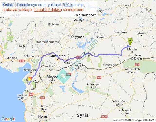 Kışlak - Tomruksuyu arası yaklaşık olarak 90 km/h ile yukarıda belirtilen sürede olup, iki yerin kuş uçuşu uzaklığı (mesafesi) 433'dir. Eğer belirtilen yerler arasında uçak seferi var ise bu süre uçakla 39 dakika'ya kadar düşebilir. Yolculuk otobüsle 8 saat 55 dakika sürmektedir.