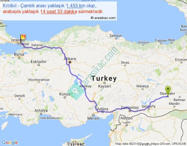 Kıtılbıl - Çamlık arası yaklaşık olarak 90 km/h ile yukarıda belirtilen sürede olup, iki yerin kuş uçuşu uzaklığı (mesafesi) 1003'dir. Eğer belirtilen yerler arasında uçak seferi var ise bu süre uçakla 1 saat 32 dakika'ya kadar düşebilir. Yolculuk otobüsle 18 saat 54 dakika sürmektedir.