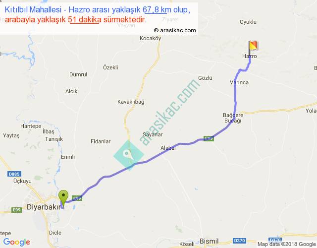 Kıtılbıl Mahallesi - Hazro arası yaklaşık olarak 90 km/h ile yukarıda belirtilen sürede olup, iki yerin kuş uçuşu uzaklığı (mesafesi) 58'dir. Yolculuk otobüsle 1 saat 6 dakika sürmektedir.