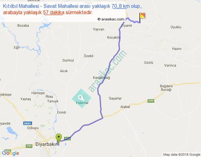 Kıtılbıl Mahallesi - Savat Mahallesi arası yaklaşık olarak 90 km/h ile yukarıda belirtilen sürede olup, iki yerin kuş uçuşu uzaklığı (mesafesi) 56'dir. Yolculuk otobüsle 1 saat 14 dakika sürmektedir.
