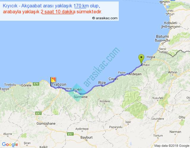 Kıyıcık - Akçaabat arası yaklaşık olarak 90 km/h ile yukarıda belirtilen sürede olup, iki yerin kuş uçuşu uzaklığı (mesafesi) 143'dir. Yolculuk otobüsle 2 saat 49 dakika sürmektedir.