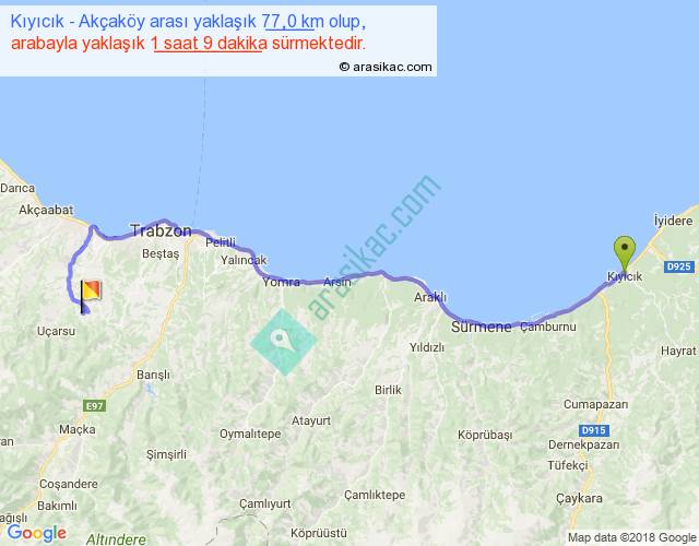 Kıyıcık - Akçaköy arası yaklaşık olarak 90 km/h ile yukarıda belirtilen sürede olup, iki yerin kuş uçuşu uzaklığı (mesafesi) 57'dir. Yolculuk otobüsle 1 saat 29 dakika sürmektedir.