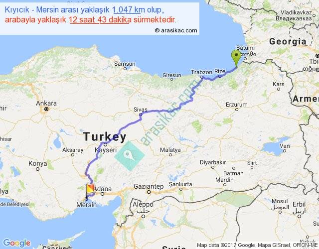 Kıyıcık - Mersin arası yaklaşık olarak 90 km/h ile yukarıda belirtilen sürede olup, iki yerin kuş uçuşu uzaklığı (mesafesi) 754'dir. Eğer belirtilen yerler arasında uçak seferi var ise bu süre uçakla 1 saat 09 dakika'ya kadar düşebilir. Yolculuk otobüsle 16 saat 31 dakika sürmektedir.