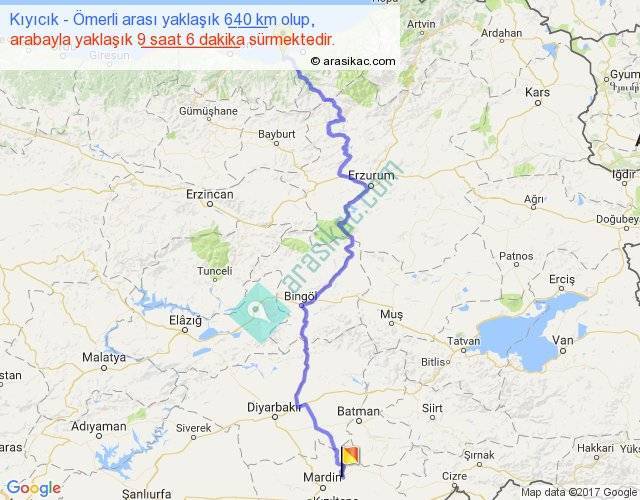 Kıyıcık - Ömerli arası yaklaşık olarak 90 km/h ile yukarıda belirtilen sürede olup, iki yerin kuş uçuşu uzaklığı (mesafesi) 397'dir. Eğer belirtilen yerler arasında uçak seferi var ise bu süre uçakla 36 dakika'ya kadar düşebilir. Yolculuk otobüsle 11 saat 49 dakika sürmektedir.