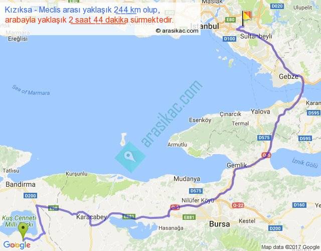 Kızıksa - Meclis arası yaklaşık olarak 90 km/h ile yukarıda belirtilen sürede olup, iki yerin kuş uçuşu uzaklığı (mesafesi) 141'dir. Yolculuk otobüsle 3 saat 33 dakika sürmektedir.
