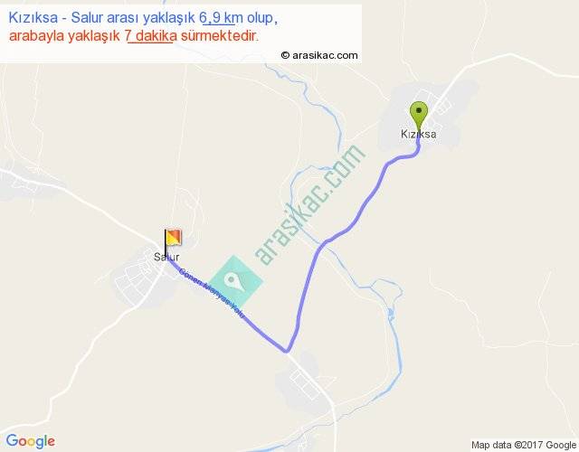 Kızıksa - Salur arası yaklaşık olarak 90 km/h ile yukarıda belirtilen sürede olup, iki yerin kuş uçuşu uzaklığı (mesafesi) 4'dir. Yolculuk otobüsle 9 dakika sürmektedir.