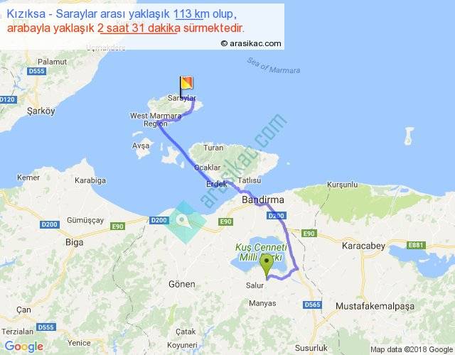 Kızıksa - Saraylar arası yaklaşık olarak 90 km/h ile yukarıda belirtilen sürede olup, iki yerin kuş uçuşu uzaklığı (mesafesi) 65'dir. Yolculuk otobüsle 3 saat 16 dakika sürmektedir.