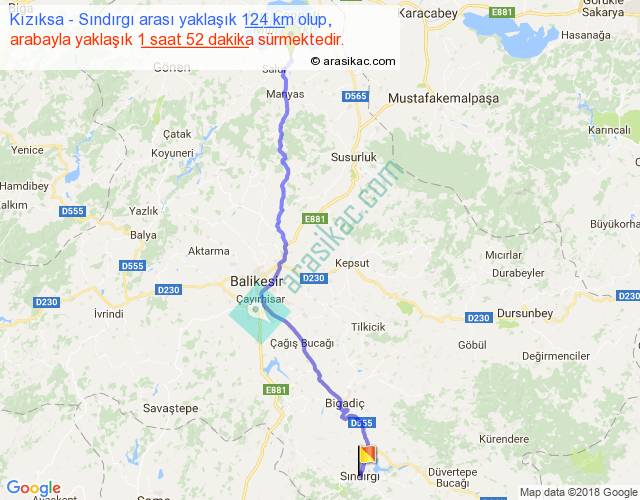 Kızıksa - Sındırgı arası yaklaşık olarak 90 km/h ile yukarıda belirtilen sürede olup, iki yerin kuş uçuşu uzaklığı (mesafesi) 98'dir. Yolculuk otobüsle 2 saat 25 dakika sürmektedir.