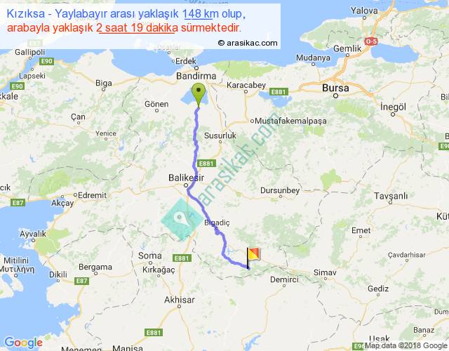 Kızıksa - Yaylabayır arası yaklaşık olarak 90 km/h ile yukarıda belirtilen sürede olup, iki yerin kuş uçuşu uzaklığı (mesafesi) 112'dir. Yolculuk otobüsle 3 saat 0 dakika sürmektedir.