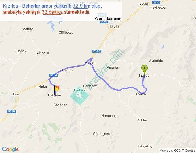 Kızılca - Baharlar arası yaklaşık olarak 90 km/h ile yukarıda belirtilen sürede olup, iki yerin kuş uçuşu uzaklığı (mesafesi) 18'dir. Yolculuk otobüsle 42 dakika sürmektedir.