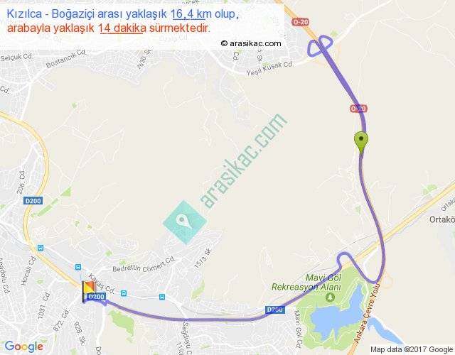 Kızılca - Boğaziçi arası yaklaşık olarak 90 km/h ile yukarıda belirtilen sürede olup, iki yerin kuş uçuşu uzaklığı (mesafesi) 6'dir. Yolculuk otobüsle 18 dakika sürmektedir.