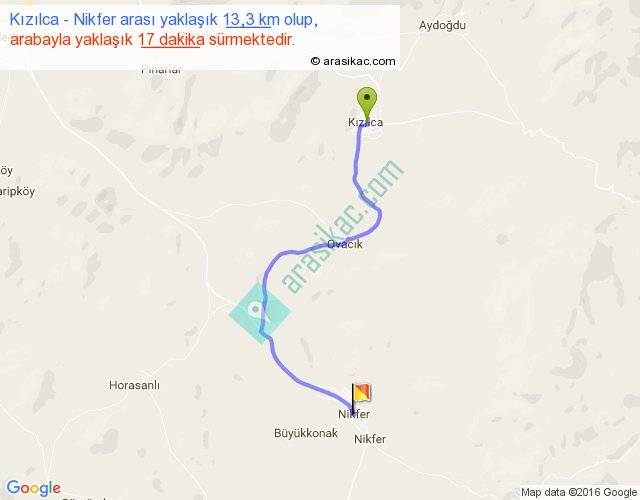 Kızılca - Nikfer arası yaklaşık olarak 90 km/h ile yukarıda belirtilen sürede olup, iki yerin kuş uçuşu uzaklığı (mesafesi) 9'dir. Yolculuk otobüsle 22 dakika sürmektedir.