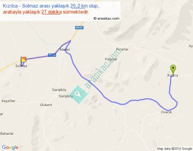 Kızılca - Solmaz arası yaklaşık olarak 90 km/h ile yukarıda belirtilen sürede olup, iki yerin kuş uçuşu uzaklığı (mesafesi) 15'dir. Yolculuk otobüsle 35 dakika sürmektedir.